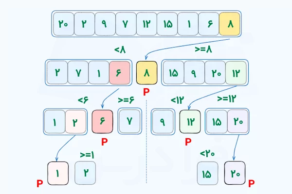 - روش کار: یک عنصر به نام "محور" انتخاب میشود. اعداد کوچکتر به سمت چپ و اعداد بزرگتر به سمت راست محور منتقل میشوند. سپس همین فرآیند برای دو طرف تکرار میشود.