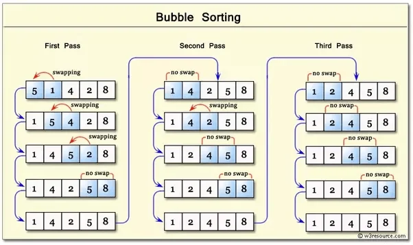 - روش کار: الگوریتم از ابتدای لیست شروع کرده و هر دو عنصر مجاور را با هم مقایسه میکند. اگر ترتیب آنها غلط باشد، جایشان را عوض میکند. این کار را آنقدر تکرار میکند تا بزرگترین عنصر مانند یک حباب به انتهای لیست برسد.